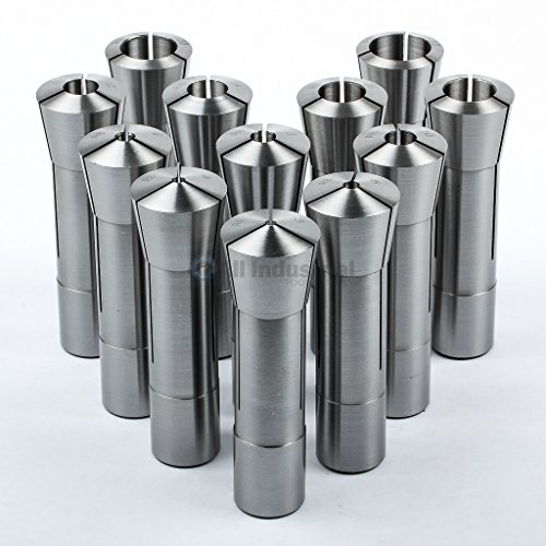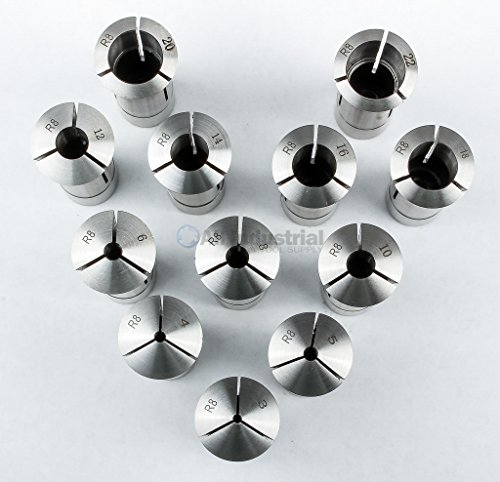 High precision 12 piece set includes 3, 4, 5, 6, 8, 10, 12, 14, 16, 18, 20 and 22mm R8 collets