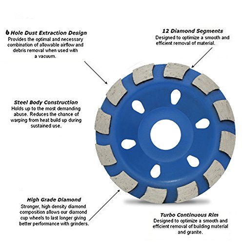 This aggressive turbo cup grinding wheel provides for very fast cutting action on masonry, stone and concrete