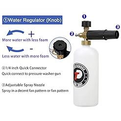 EASY to install: fill some soap into the bottle with warm water to get thick foam; Then connect 1/4″ quick connection plug to Pressure Washer Gun or Wand. Finally, adjust the knob on the top to desired foam level and then foam sprayer will disperse thick foam. The knob adjusts the foam dispensing amount and the nozzle adjusts the sprinkle pattern.